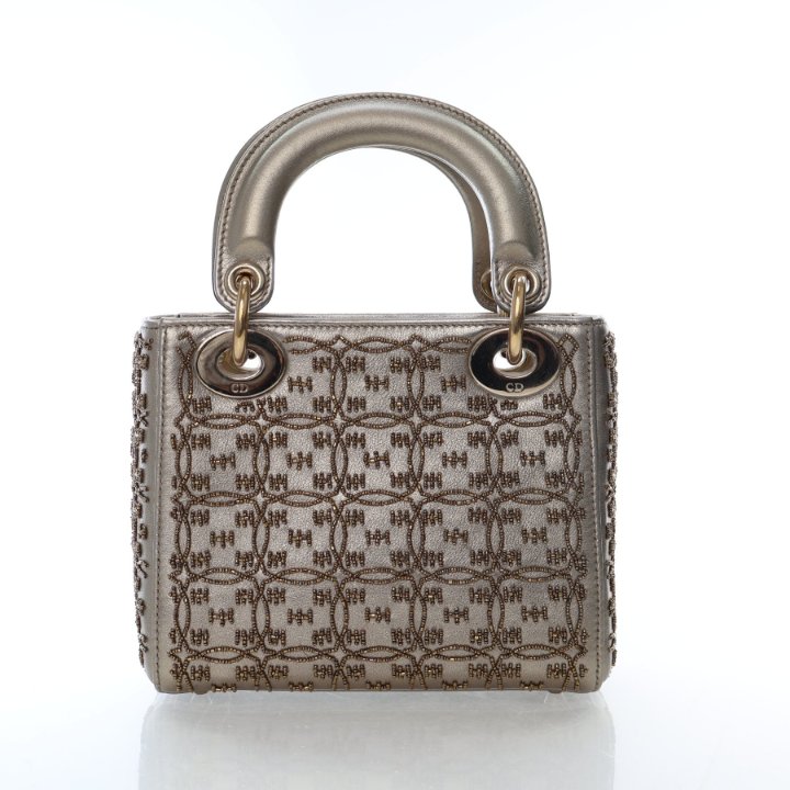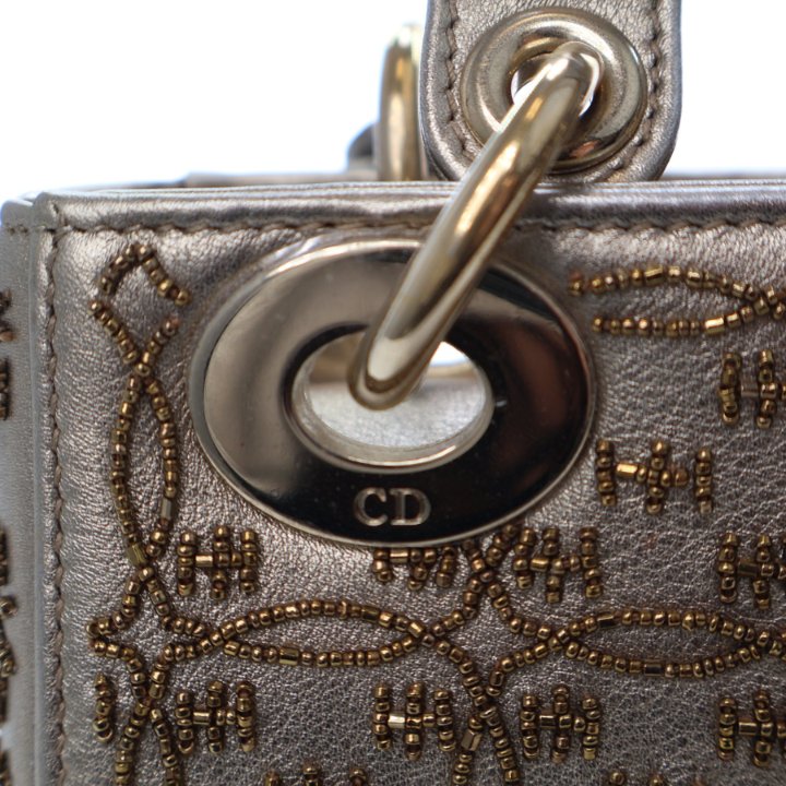 The Mini Beaded Lambskin Lady Dior is a luxurious Christian Dior bag in gold lambskin with delicate bead detailing and light gold hardware. Its compact silhouette with a removable strap makes it perfect for elegant day or evening occasions.