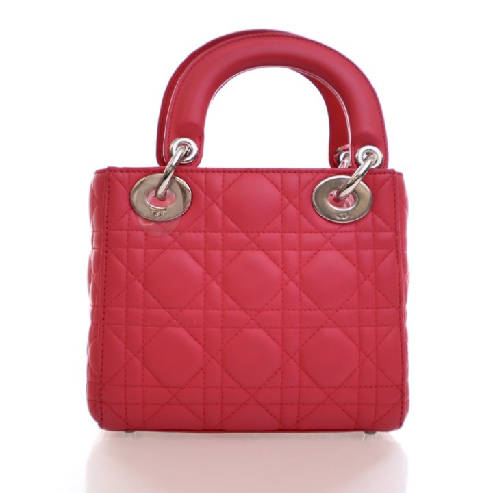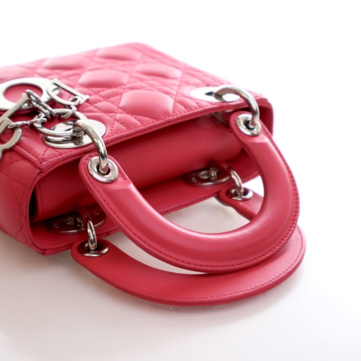 The Mini Lambskin Lady Dior is a luxurious Christian Dior bag in pink lambskin with silver hardware. Its compact silhouette and elegant design make it perfect for both day and evening use.