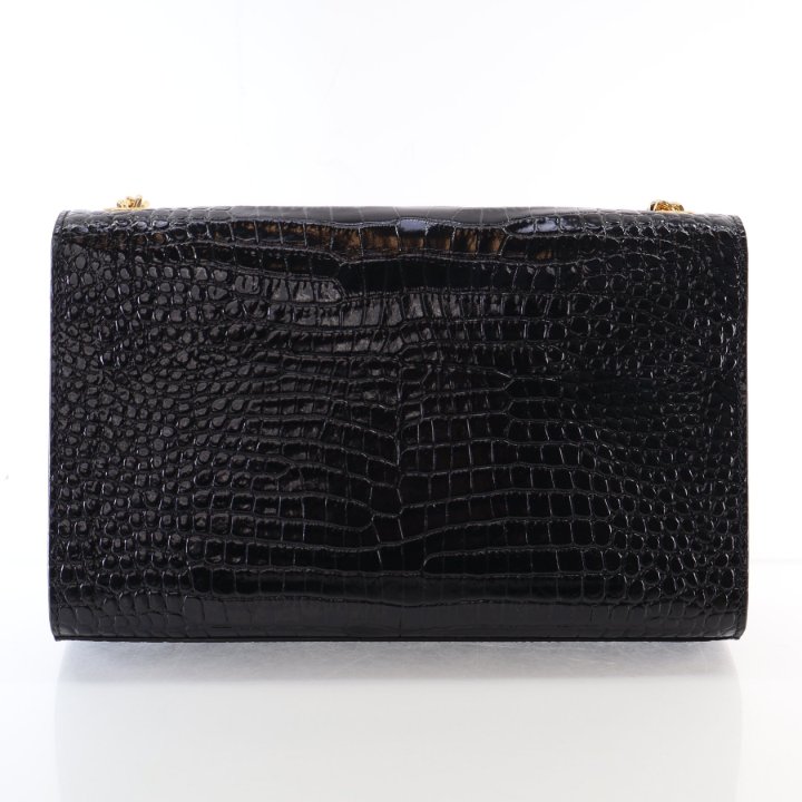 The Saint Laurent Calfskin Croc Embossed Kate Tassel is crafted from black croc-embossed calfskin leather with gold-tone hardware. Featuring the iconic YSL monogram and signature tassel detail, this elegant shoulder bag offers a sleek and timeless silhouette. A refined Saint Laurent piece suitable for both day and evening use.