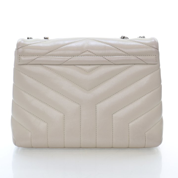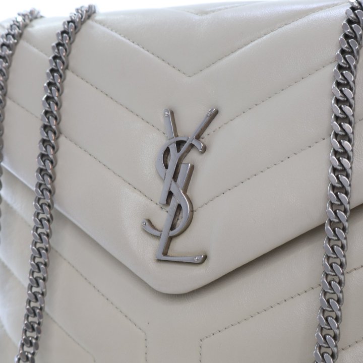 The Saint Laurent Calfskin Loulou Bag is crafted from white calfskin leather with elegant silver and aged silver-tone hardware. Featuring the brand’s signature quilted design and iconic YSL logo, this bag offers a refined yet modern look. Its adjustable chain strap allows for versatile styling, making it suitable for both daytime wear and evening occasions.